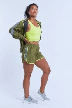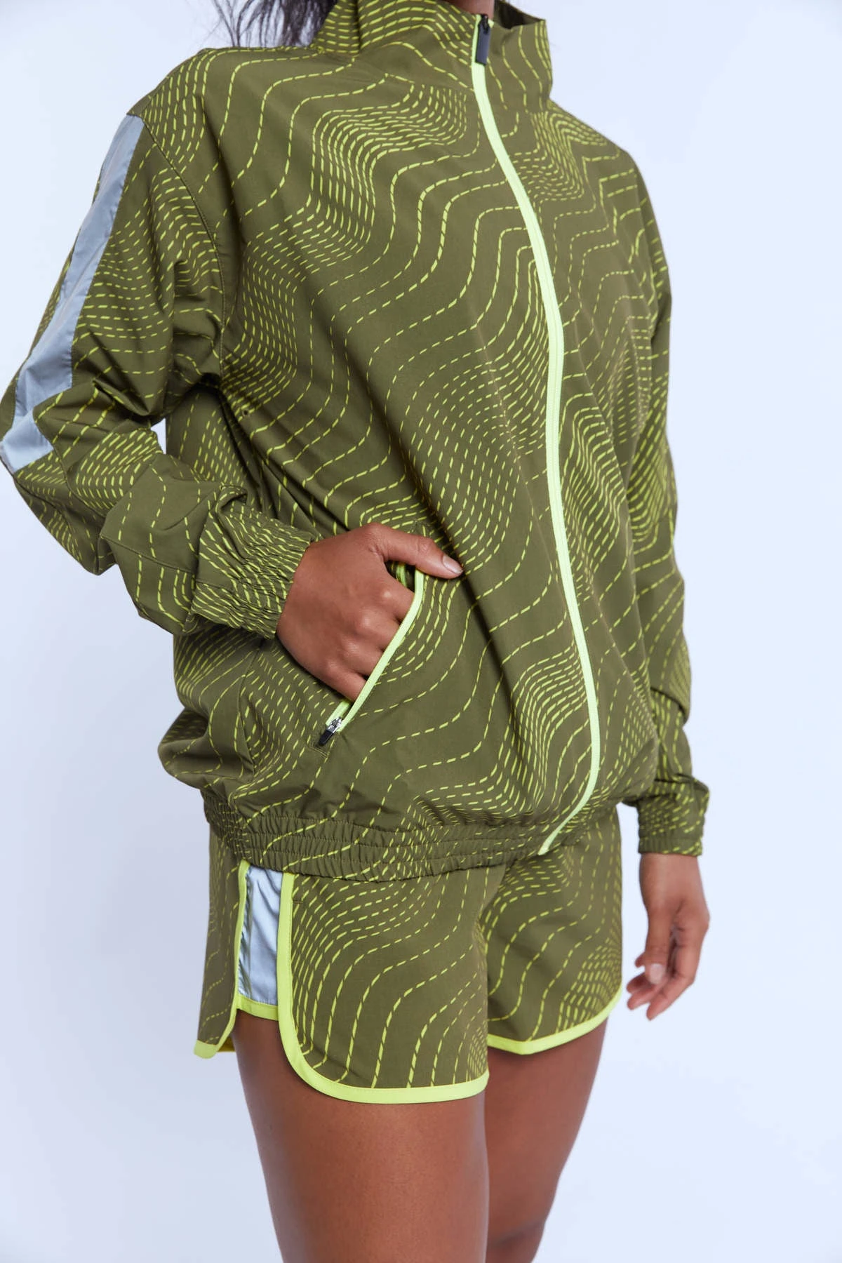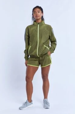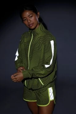 A performance outerwear piece to keep you warm and top off your activewear look. Built with an inner layer of mesh, zip pockets and a back vent, this lightweight jacket is perfect for a chilly jog, an early morning hike, or a walk around the frozen food section- plus it’s got reflective paneling at the sides for maximum visibility at night. Zip up and get going wherever you’re going.