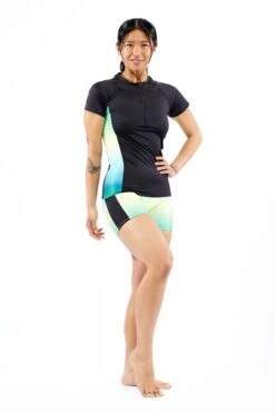 Get ready to swim or lounge poolside with our new rash guard. This style was inspired by cap sleeve bike tees – loose enough that it can be layered over other swim tops or worn alone without feeling exposed. You’ll find the fit is similar to our Swim Tank. To keep you comfy, we’ve included raglan sleeve seaming for less rubbing at the shoulders during your swim workouts or beach volleyball. There’s also a quarter zip detail at the neckline with zipper guard for protection and comfort. Length hits around hip bones.